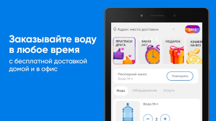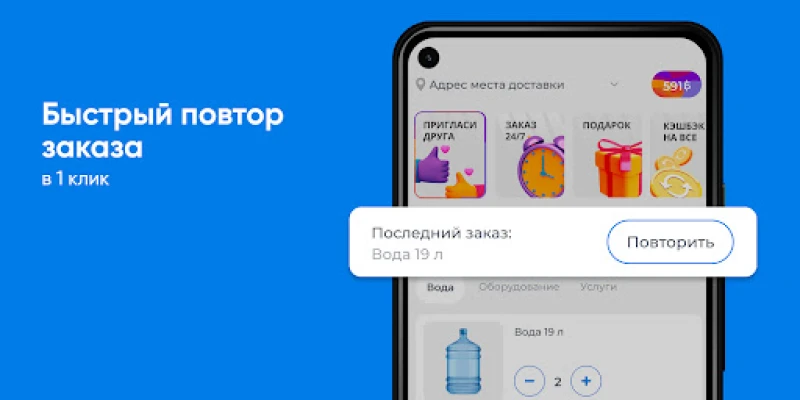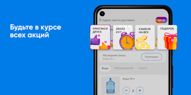 Скачайте приложение AQUA на свой смартфон и делайте заказ воды 24/7. Вы сможете повторять заказ нажатием одной кнопки, видеть всю историю покупок и быть в курсе всех акций компании.