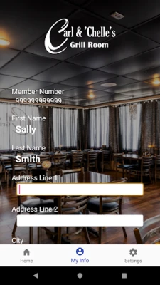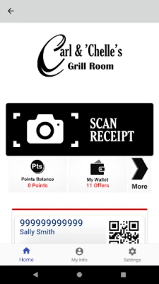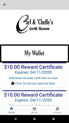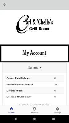 The Carl & Chelle's Grill Room mobile app delivers offers and loyalty information to on-the-go customers, giving quick access to exclusive deals, enrollment options, loyalty point balance and rewards lookup, loyalty program information, and information about our business