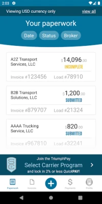 Upload and Create Paperwork The TriumphPay app allows you to manage your paperwork in one place. We know you’re busy, so we made the payment process easy.